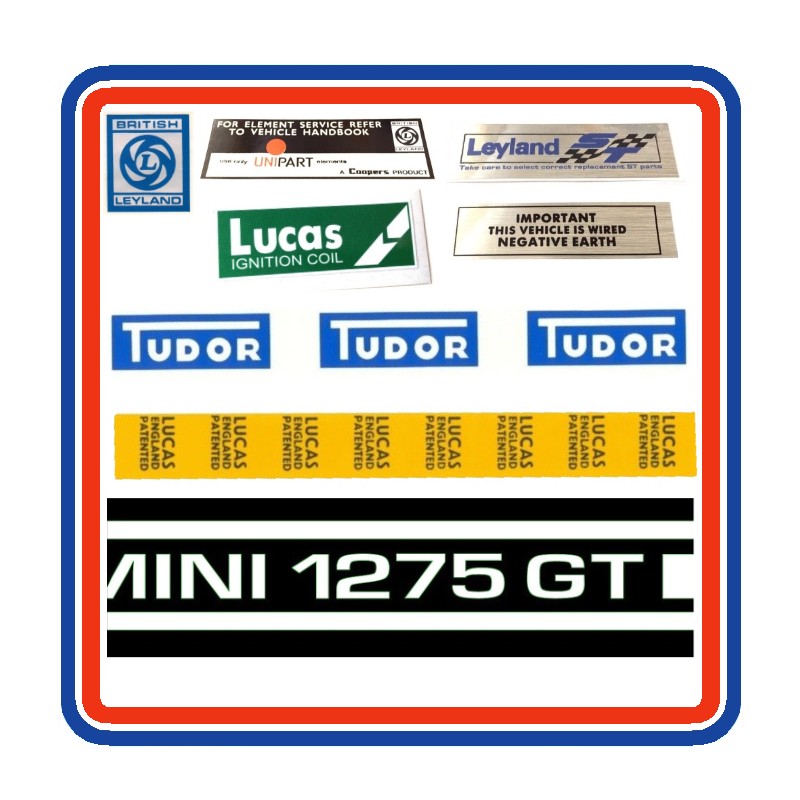 Mini 1275GT 7 Piece Engine Bay Sticker Bundle with white side stripes